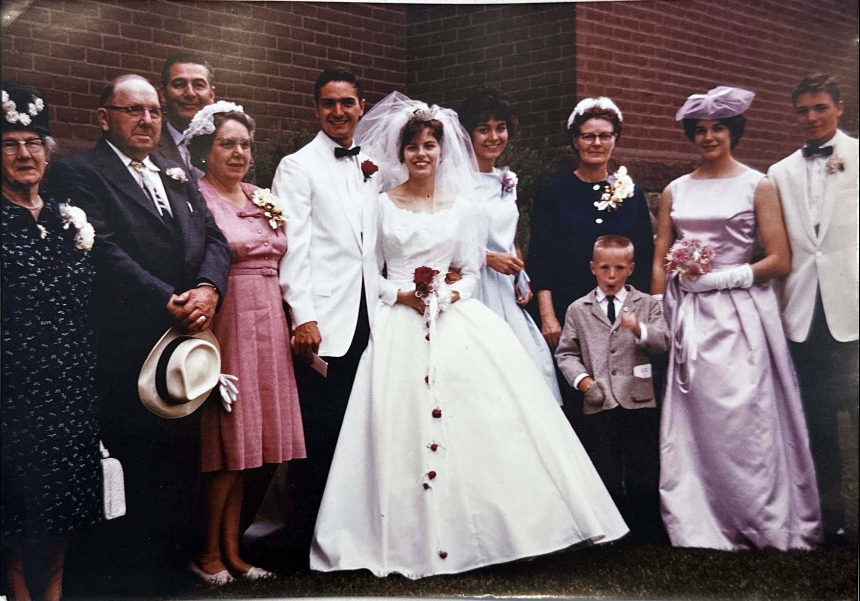 Dick and Barbara 1963. Family photo. Spencer’s great-great grandparents, Rosa and Ferdinand Busch, are at left. His great-grandparents, Henry and Esther (Busch) Bernard, are next to me. My sisters Mary Ann and Florence, and my brother Frank are at right, along with Barbara’s mother and brother. My brother, John, then 15, and possibly the photographer, was there as well. Mary Ann, Frank and John were at the wedding on Sunday. Flo and her husband were unable to attend.