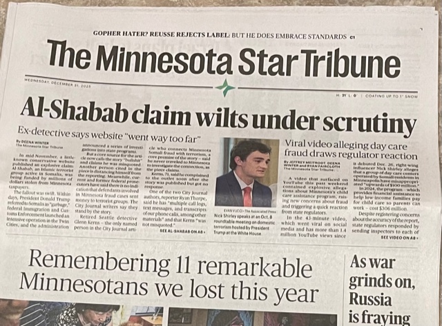 This morning’s Minnesota Star Tribune has two long articles on two exposes on allegations that have received considerable air time. Here’s the front page: Of course, to the perpetrator, the accusation is all that matters. The rumor mill takes care of the rest. In this case, the media went wild. A year or more ago I had personally visited one of the alleged sites in one of the articles. It was very much a normal day in a normal place doing normal things for normal people. I was with my sister, and the uncle of one of the employees at the center – an administrator. Most people didn’t have the opportunity I had…. [Jan. 1, 2026 front page headline at end of post] [Jan 1. I found that the place I visited was not one of the sites visited by the “journalist”. It was, however substantively identical to the mischief maker.]