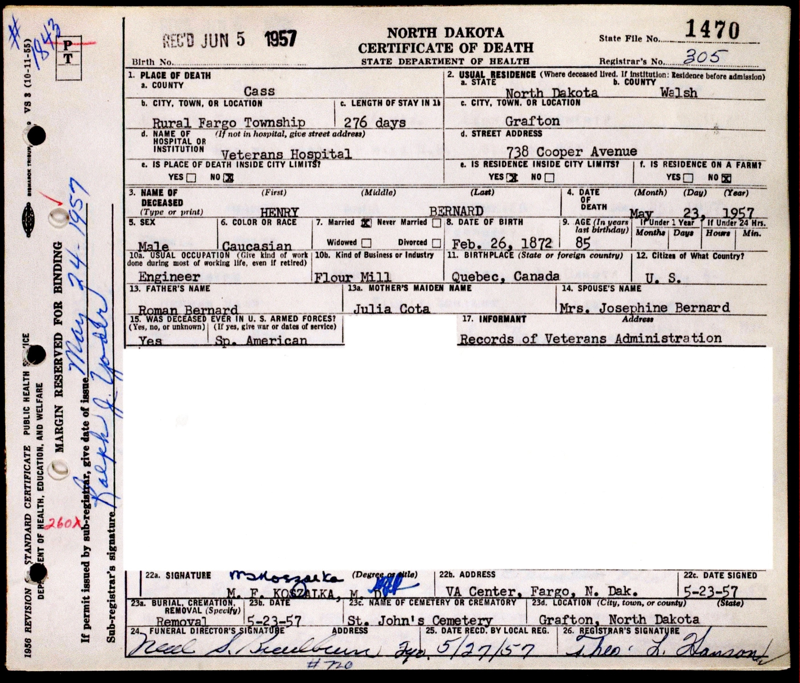 Dec. 14, my brother, John, sent an e-mail with a most intriguing document: the death certificate for our grandfather Henry Bernard, died May 23, 1957 in Fargo ND (below). I’ve done much family history, but had never seen this document, which John had received from a local friend who’s an amateur ancestry researcher.